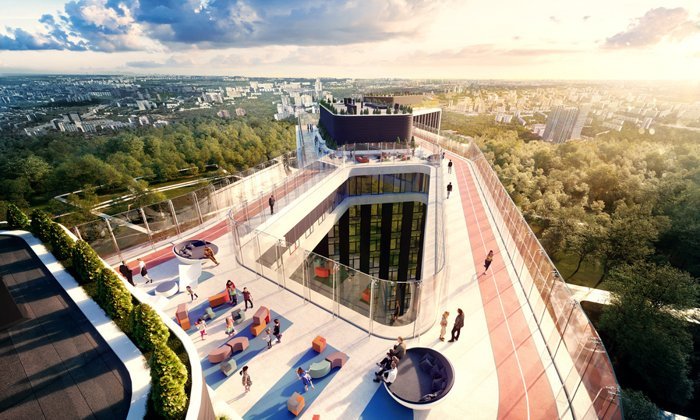 Помимо фитнес-рума с потрясающим видом на сити, жителям комплекса предоставлена возможность позаниматься на воркаут площадках и пробежаться по дорожке на высоте 170 метров над уровнем города.