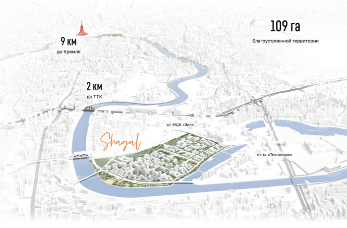 Комплекс находится в Даниловском районе Москвы, всего в 9 км от Кремля на живописной набережной Марка Шагала. Есть быстрый доступ к станциям метро, ТТК и речному транспорту